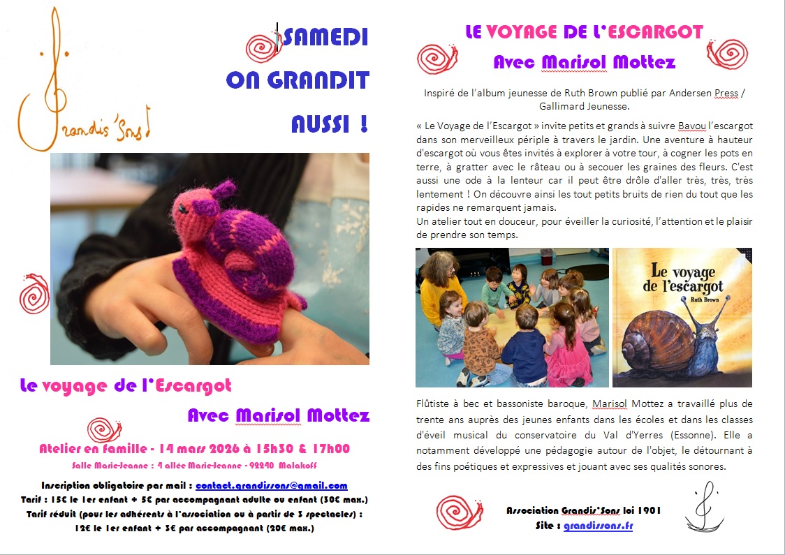 Nous vous invitons à fêter le Printemps avec Le voyage de l’escargot le 14 Mars pour les familles et le stage de Conte le 15 Mars pour toute personne passionnée par les liens entre les mots et la musique. Nous terminerons l’année avec Calabas’Sons le 6 juin et le 7 Juin nous vous proposerons un TR adhérents pour une surprise ( détails à venir) au Plus Petit Cirque du Monde à Bagneux….